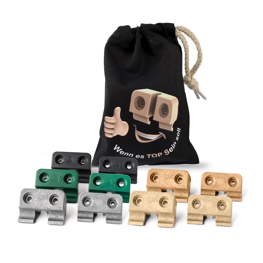 Uns ist egal, welche Stabgitterzaunstärke du dir ausgesucht hast: wir führen die Tops Montageblöcke in allen gängigen Stärken: 6/5/6mm oder 8/6/8mm. Damit farblich alles abgestimmt ist, bekommst du den Tops Zaunhalter in den üblichen RAL-Farben verzinkt (silbergrau), anthrazit und grün.
